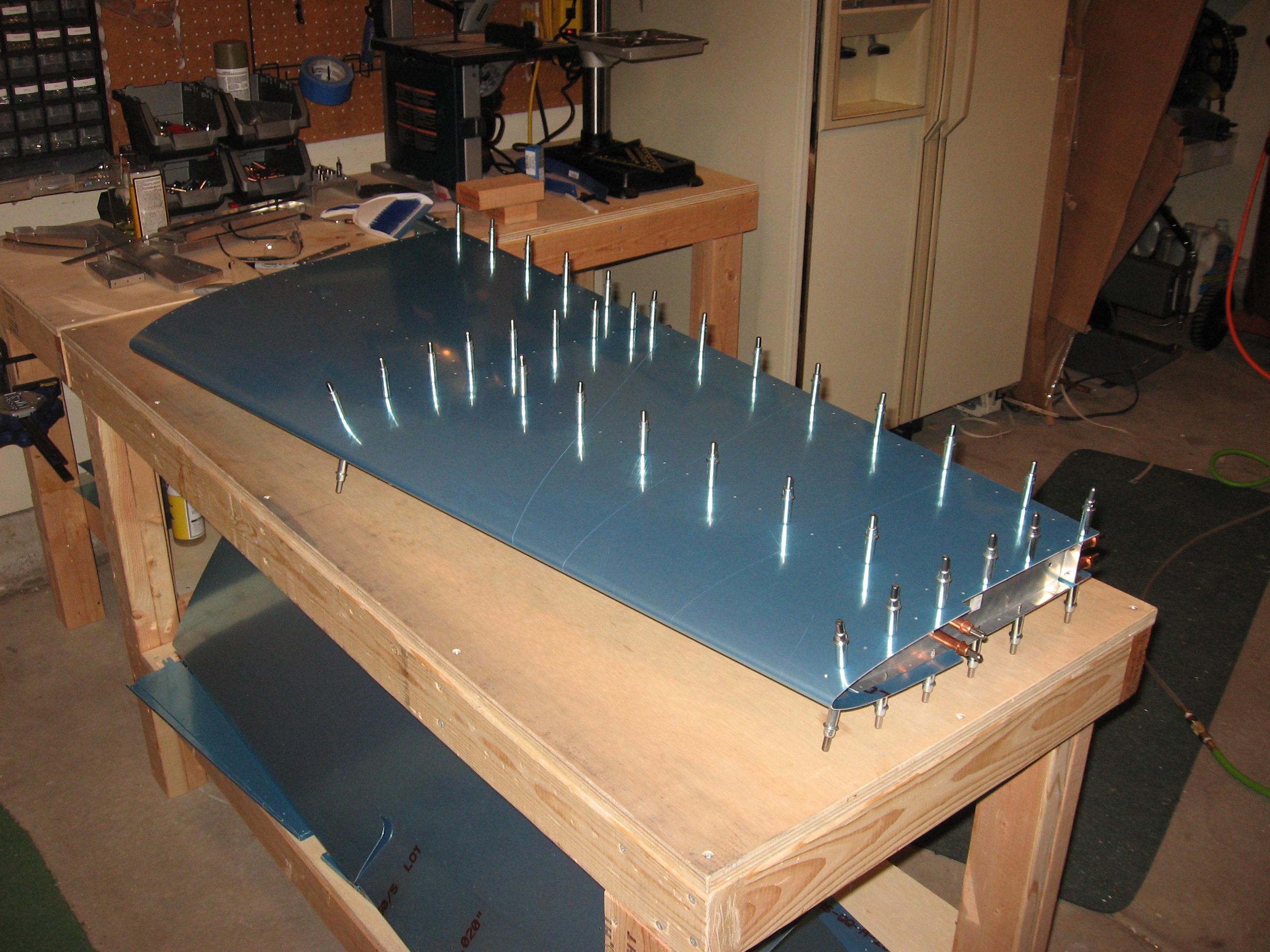 Then I clecoed on the skin and got it ready to final drill all the holes in the skins. That will wait til tomorrow. It’s very exciting. It finally looks like it belongs a plane.