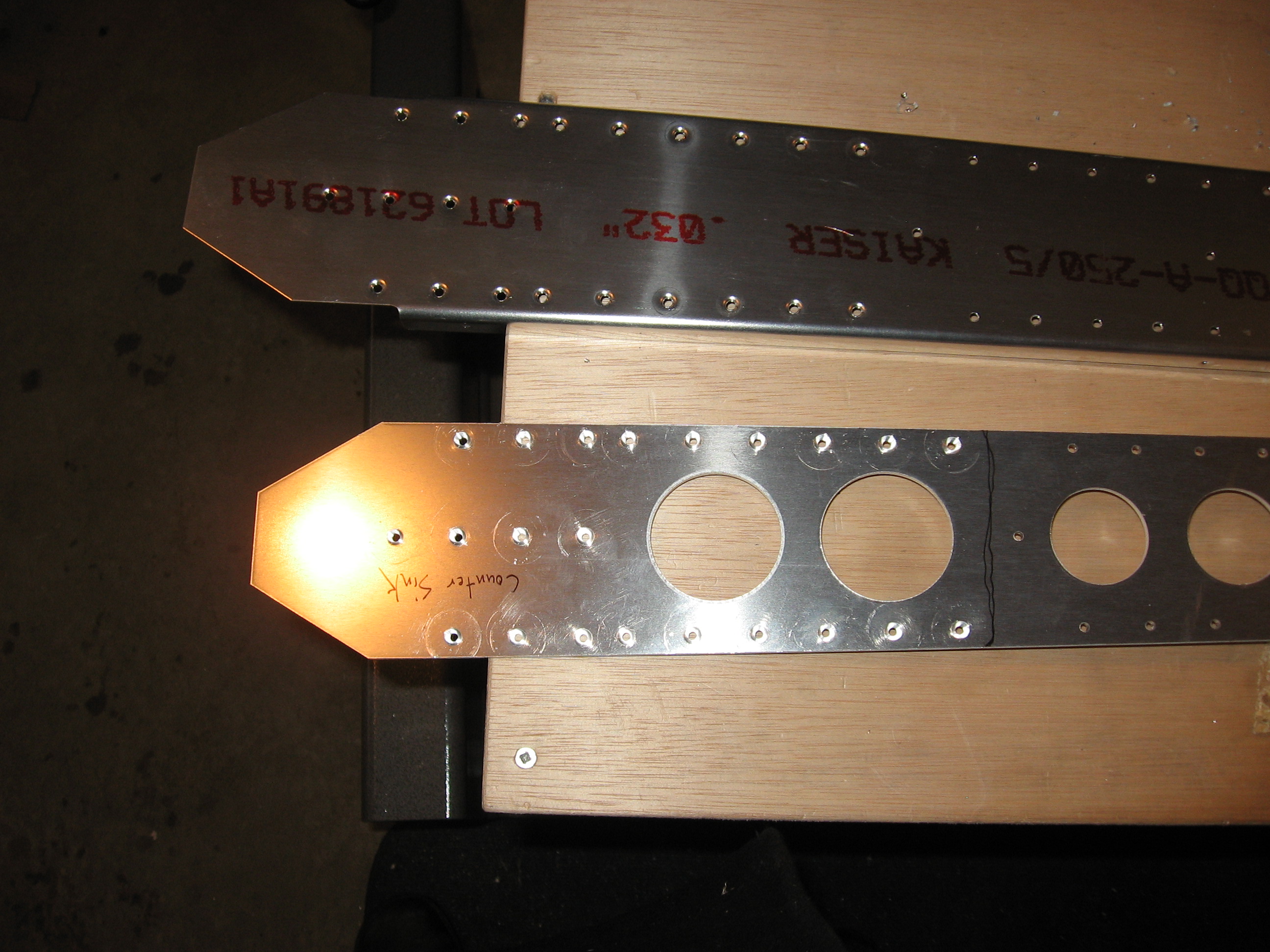 Didn’t have much time today so I just finished dimpling the rear spar and countersinking the reinforcement plate. Below the line I drew, the rivets used are flush rivets. This is because the forward side of the spar attaches to the rear of the fuselage. You’ll see in later pictures (about 5 years from now 😉 ).