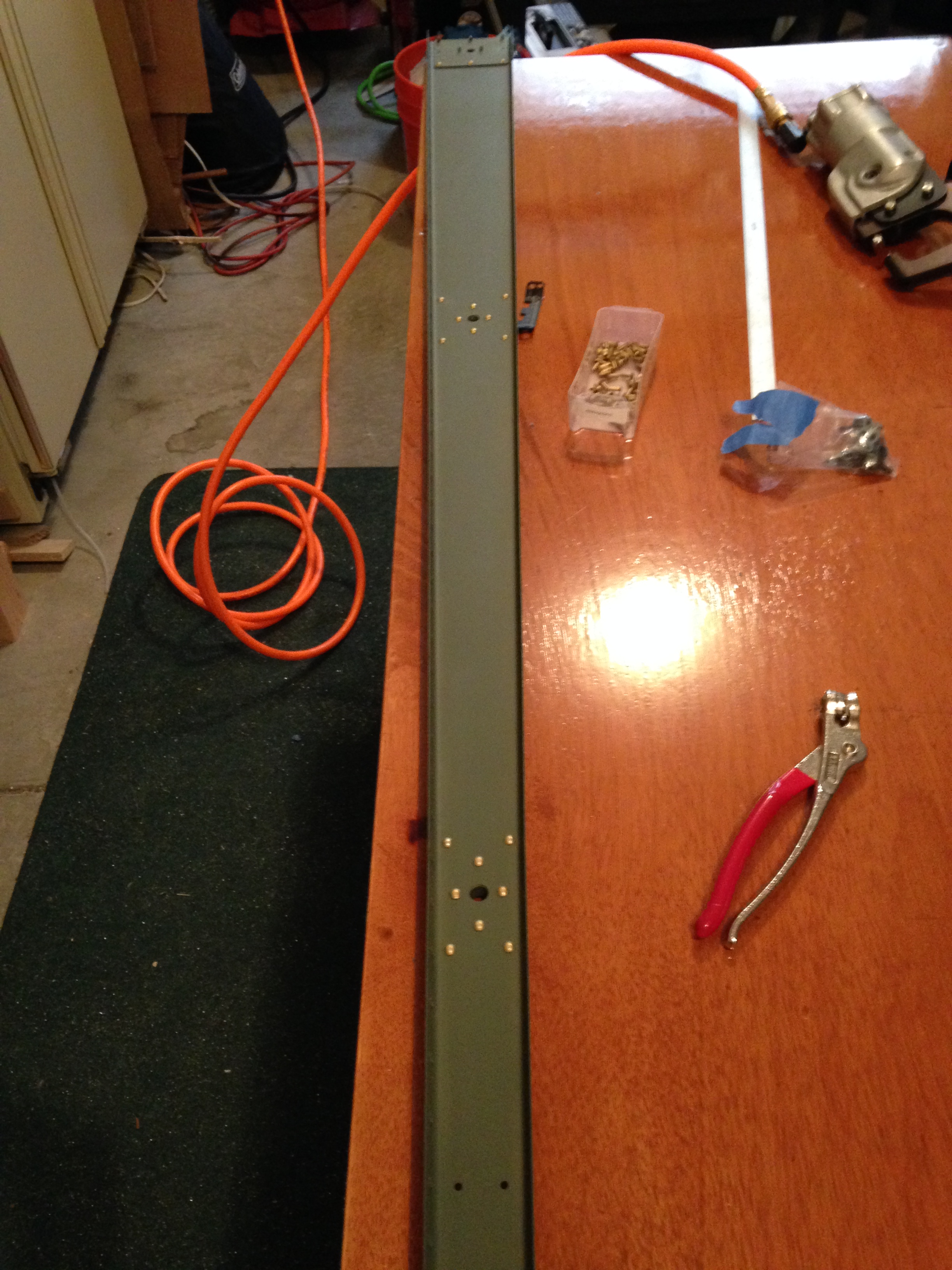 Riveted the rudder skeleton together today. I had ordered a flange nose yoke for the squeezer. Wished I had had one all along. This allowed me to get to the rivets inside the horn brace. I was able to use the squeezer for the most fo the rivets except the ones connecting the counter balance rib to counterbalance skin.