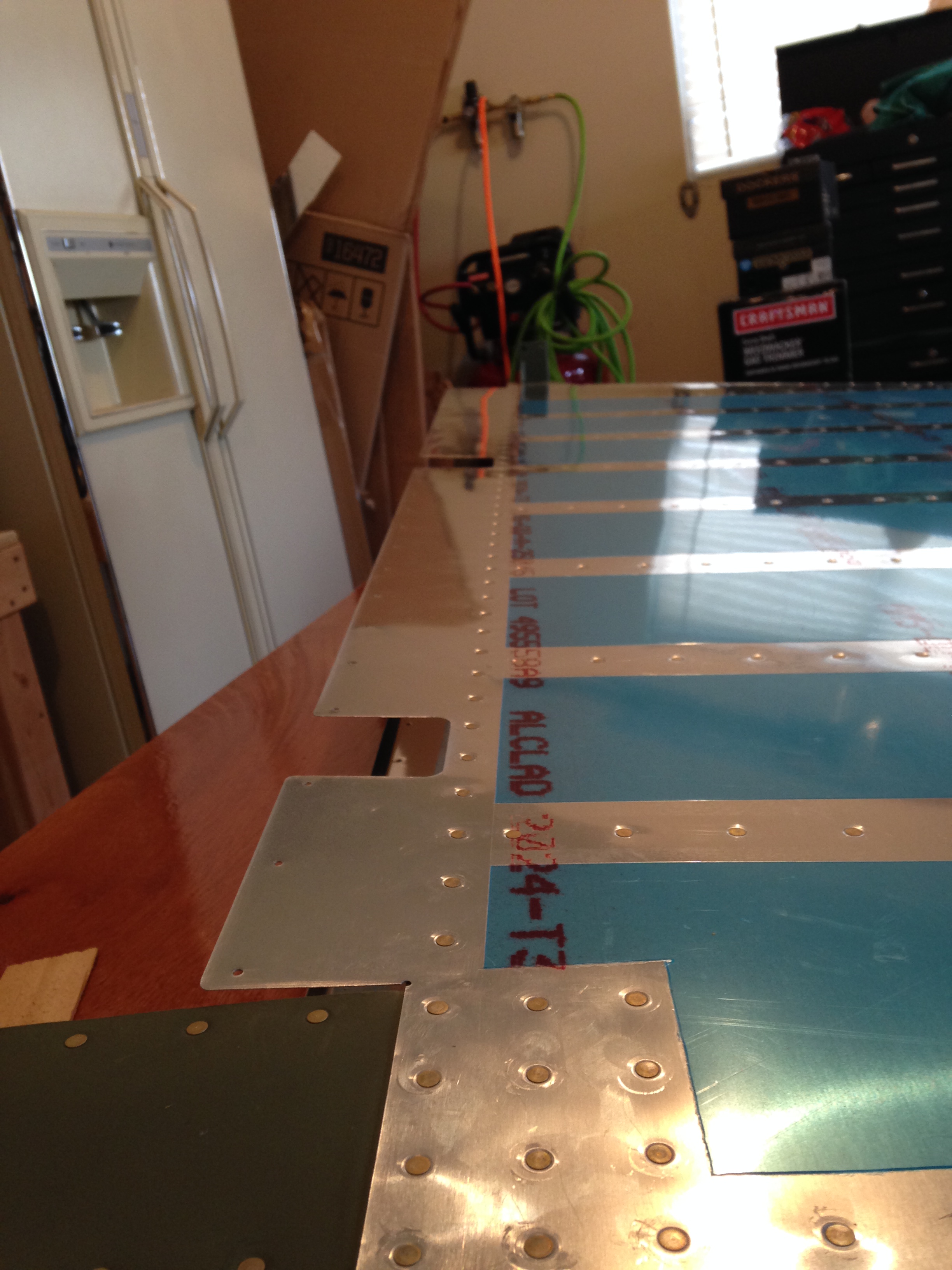 The skins are almost riveted on. The aftmost 3-4 rivets on each side of the top and bottom rib are very difficult to get to with either a squeezer or bucking bar. Van’s states that you can substitute pop rivets for the last 1-2. I stopped here for the night while I tried to figure something out.