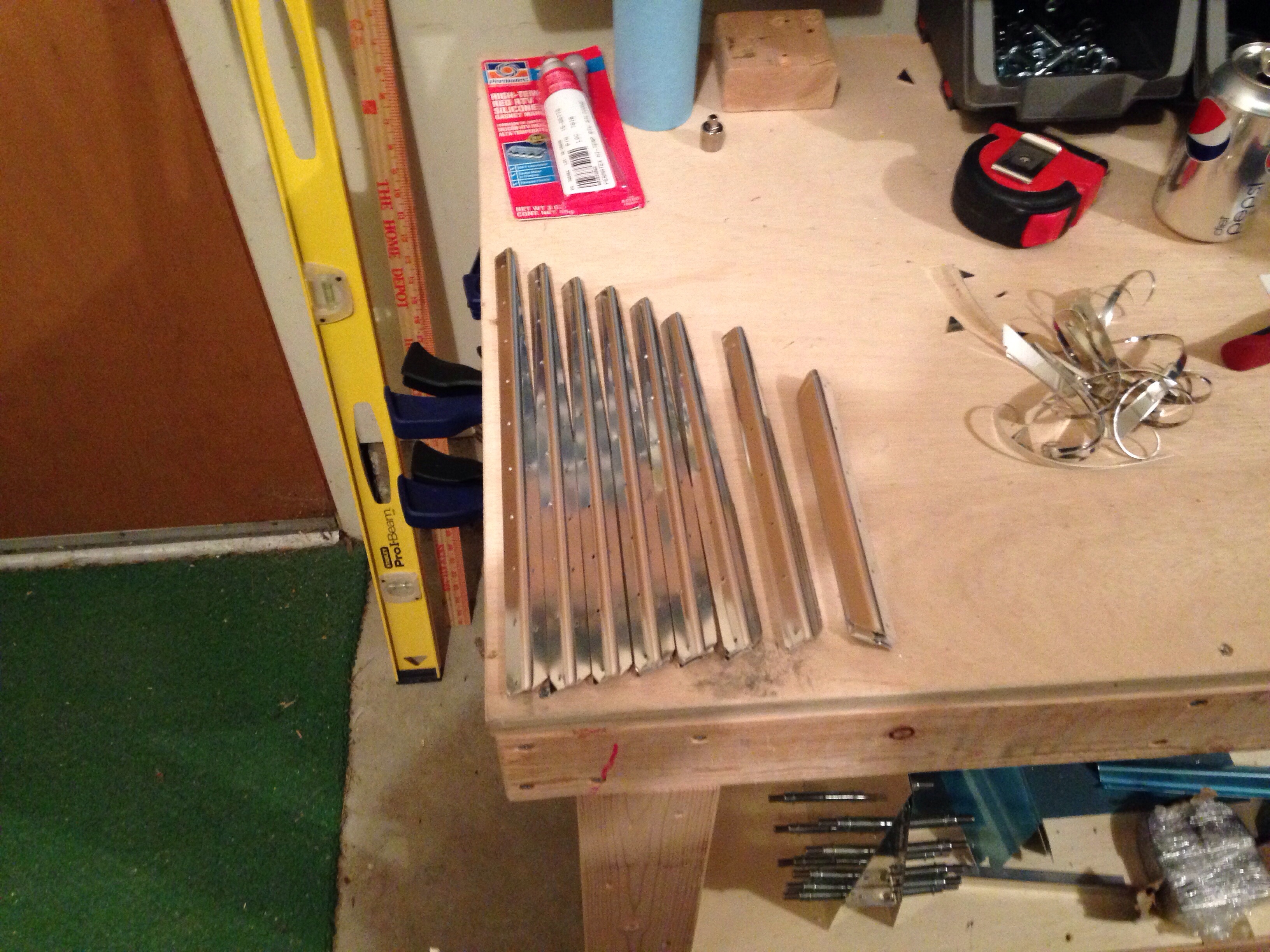 I am still waiting for the trailing edge on the rudder to cure. I decided to get started on the elevator while I wait. There are long pieces of aluminum angle with holes marking the trim lengths for most of the pieces. On the left elevator, the outboard stiffeners are slightly closer to the outboard end which requires a sliver more trimmed off each stiffener except the most outboard pair. This is because the trim tab is located on the left elevator.