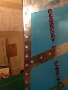 Well today was the big day to finish up the rudder trailing edge. The sealant was finally dry. I started by cleaning out any sealant from the dimples and using a razor blade to slice off any that had seeped out of the trailing edge. Then I used a back rivet set to partially set each rivet. Flipped it over and used a mushroom set to drive the rivets the rest of the way. All in all it was pretty straight but, a little bulgy. I checked on this and I think I set some of the rivets a little too tight