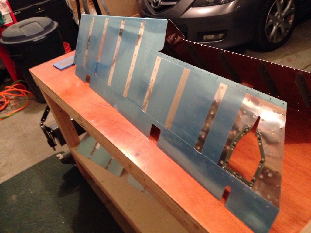 I managed to get all the stiffeners and trim servo access panel/stiffener riveted onto the left skin. The aft most rivets were a pain. You can get to them with the rivet gun, but you really need 3 hands. One extra to peel the skin back. I clamped the skin to the table, put both hands on the rivet gun and used my head to push the opposite side skin back. I ended up having to drill out and replace one rivet because the stiffener wasn’t sitting flat against the skin and the rivet swelled into the gap. No biggie. All in all, I’m pleased. The right side should be easier.
